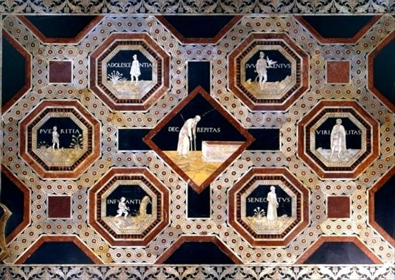 Gli artisti che fornirono i disegni furono soprattutto senesi:Sassetta, Domenico di Bartolo, Matteo di Giovanni, Domenico Beccafumi e l'umbro Pinturicchio, che ci ha lasciato il famoso riquadro del pavimento con il Monte della Sapienza…